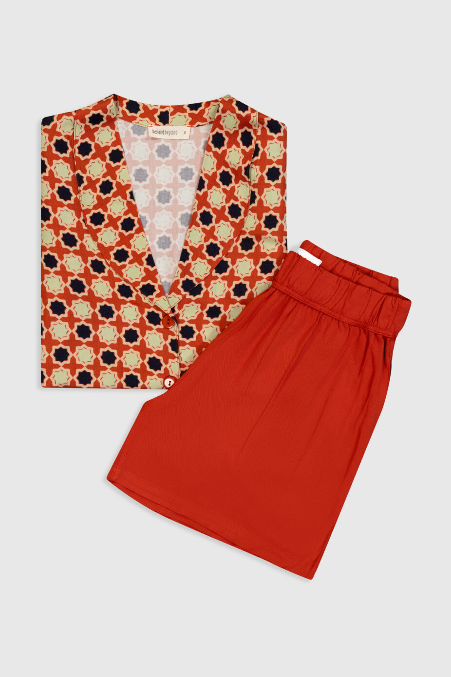 Kısa pijama takımı viskon dokusuyla buluşunca, hem konfor hem de stil bir araya gelir. Abaculus desenli bu özel tasarım, geçmişin sıcaklığını modern ev giyimi anlayışıyla birleştiriyor. İlhamını, anneannenin mutfağındaki nostaljik seramik karolardan alan desen; zihinsel yorgunluklara karşı sakinleştirici bir estetik sunar. Hayatın hızına kısa bir ara vermek isteyenler için tasarlandı.