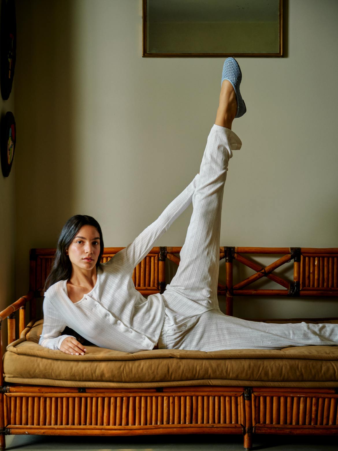 Yalın ve doğal bir tavırla, evin içinde var olan ama çoğu zaman fark edemediğimiz küçük duraklara odaklandık. Çünkü bazen hiçbir şey yapmamak da yeterlidir. Ekru tonlardaki %100 pamuk kumaşlar, teni yormayan formlar ve nefes alan dokularla tasarlanan bu parçalar, evin ritmine uyum sağlıyor.